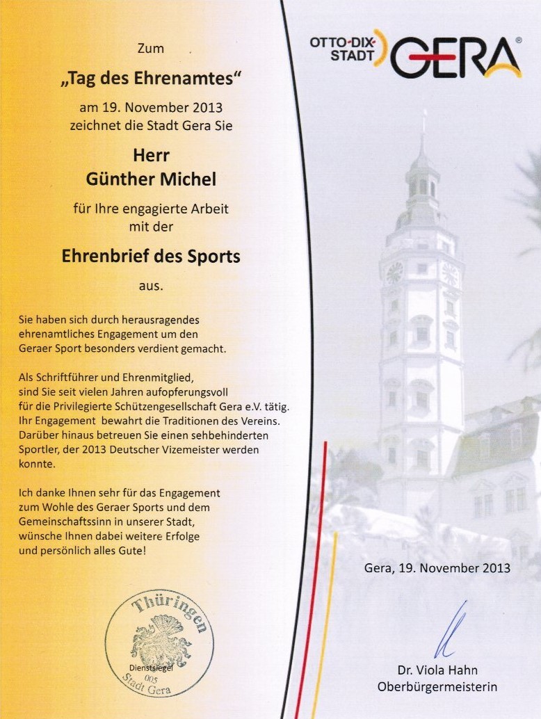Am Dienstag, den 19. November fand im KuK Gera die Auszeichnungsveranstaltung für das Ehrenamt statt. Aus unserem Verein wurde unser treues Ehrenmitglied und amtierender Schriftführer Günther Michel mit dem Ehrenbrief des Sports geehrt.