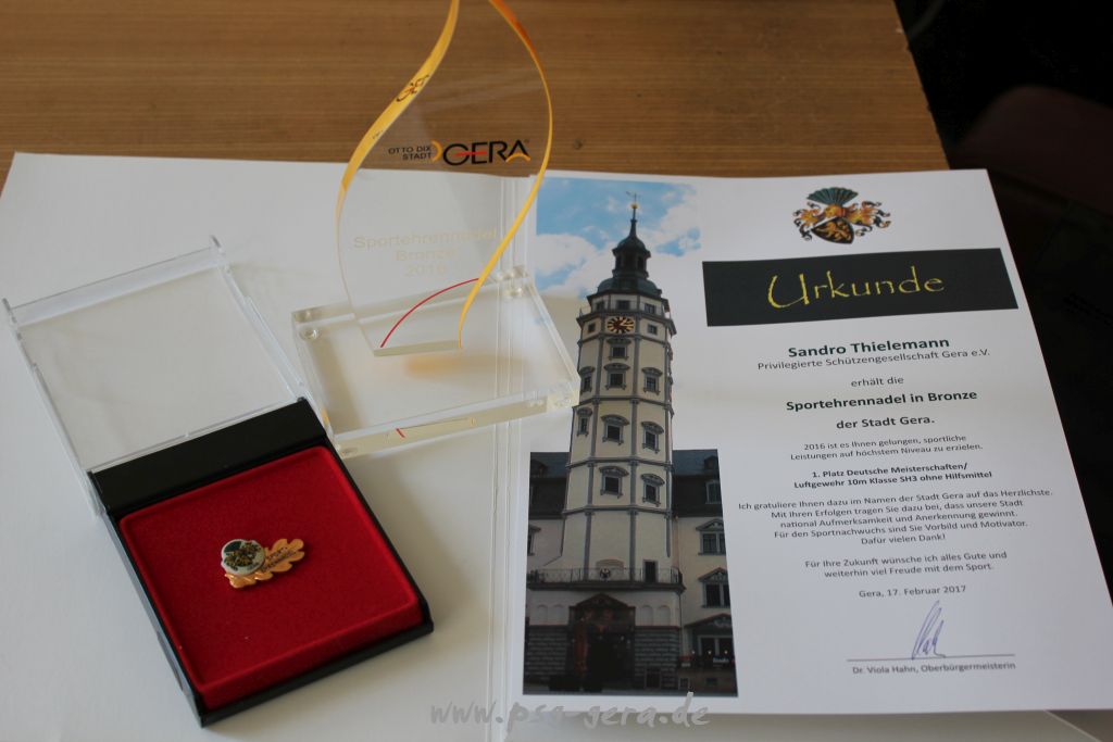 Wir gratulieren ganz herzlich unserem Schützenbruder Sandro Thielemann, welcher zur Sportlerehrung der Stadt Gera mit der Sportehrennadel in Bronze für seinen Erfolg bei der Deutschen Meisterschaft 2016 ausgezeichnet wurde.