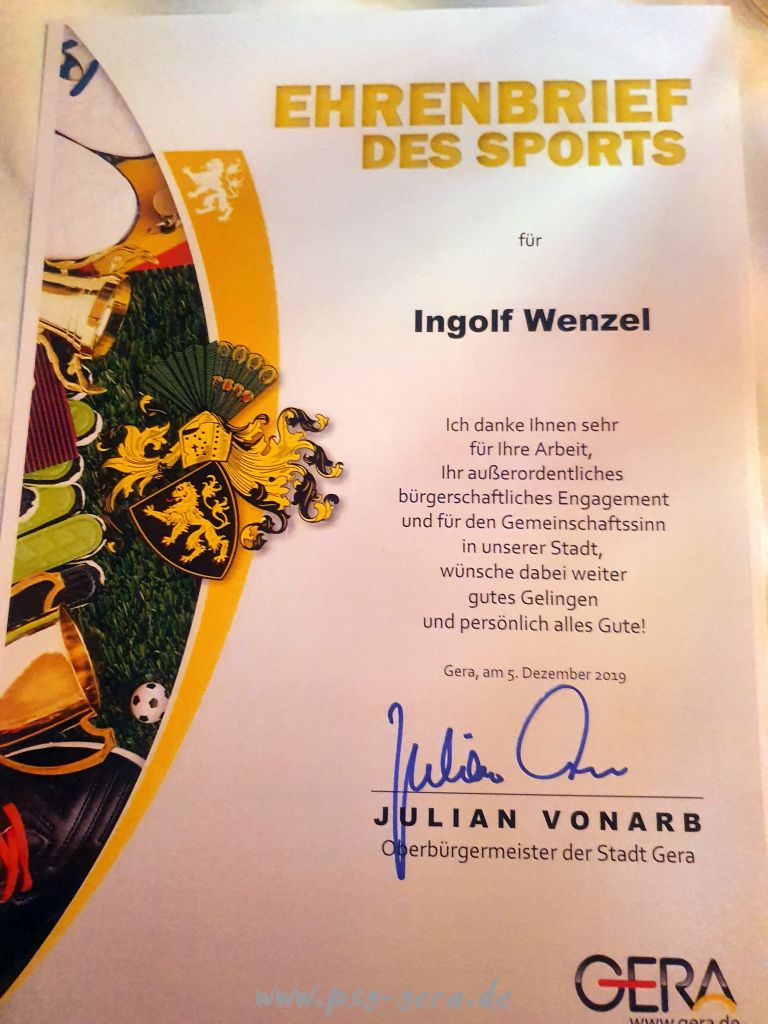 Wir gratulieren unseren Schützenbruder Ingolf Wenzel ganz herzlich zur Auszeichnung mit dem Ehrenbrief des Sports.